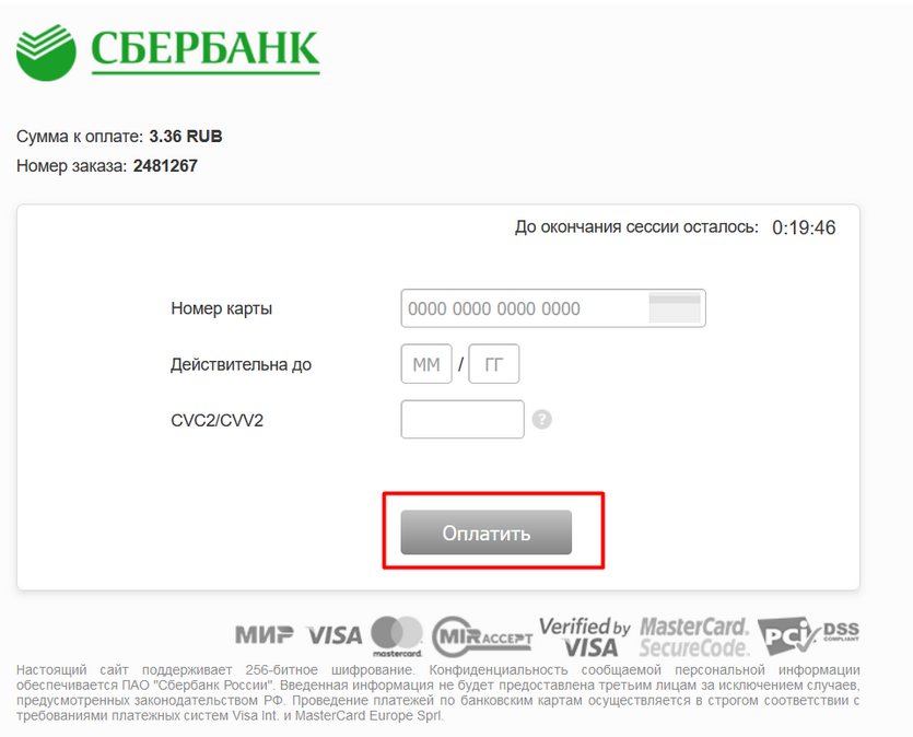7. Затем переходите к оплате, указываете данные банковской карты и выбираете "Оплатить":