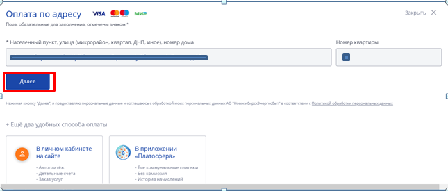 2.  Если Вы выбрали "Оплата по адресу": Заполняете адрес, затем нажимаете кнопку "Далее".