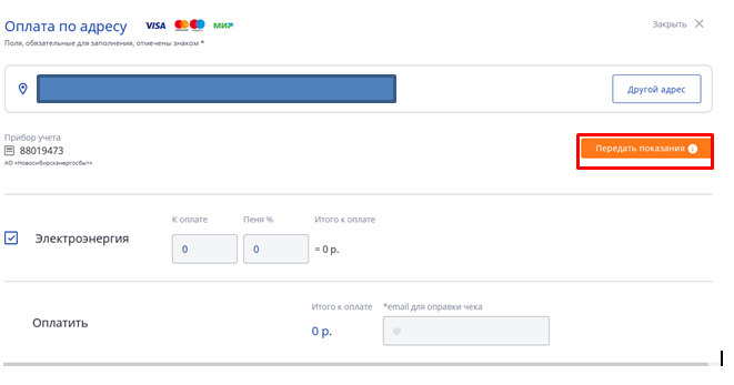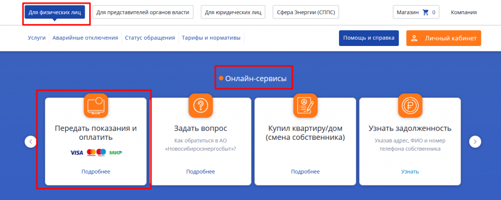 1. Для оплаты электроэнергии без комиссии и без регистрации перейдите на главную страницу сайта и кликните в меню или в блоке "Онлайн-сервисы" на ссылку "Передать показания и оплатить".