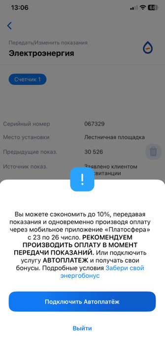 Для передачи показаний по электроэнергии Вы можете воспользоваться мобильным приложением Платосфера.