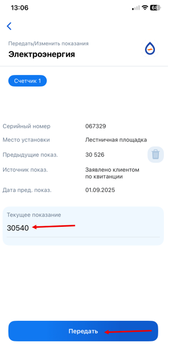3. Вводите текущие показания и нажимаете на кнопку "Передать".