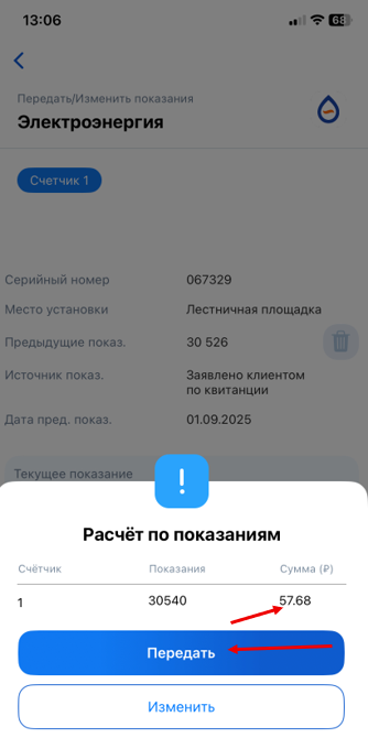 4. Выводится сумма к оплате на заявленные показания, нажимаете "Передать":