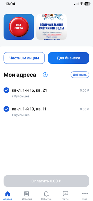 1. Выбираете необходимый адрес для передачи и оплаты показаний: