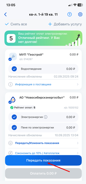 2. Нажимаете на кнопку "Передать показания" для услуг по электроэнергии: