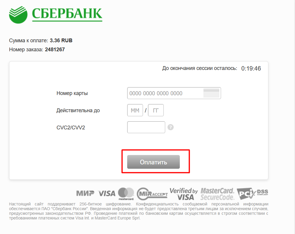 6. Затем переходите к оплате, указываете данные банковской карты и затем выбираете "Оплатить"