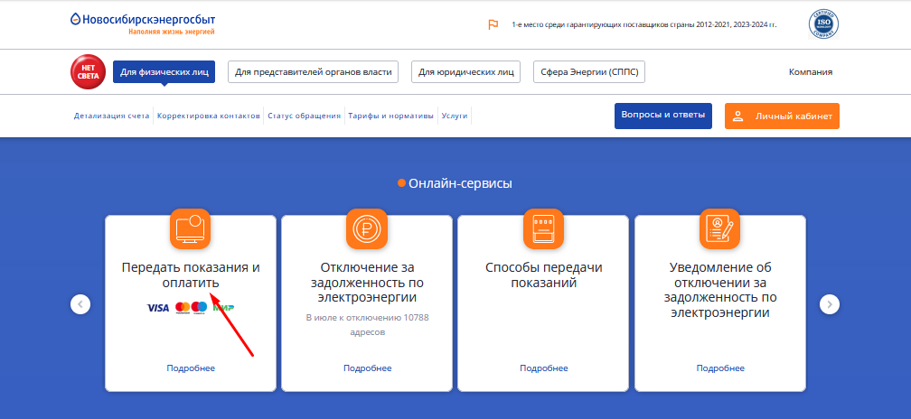 Для этого перейдите на главную страницу и выберите раздел "Передать показания и оплатить" в одном из меню, как показано на скриншоте:
