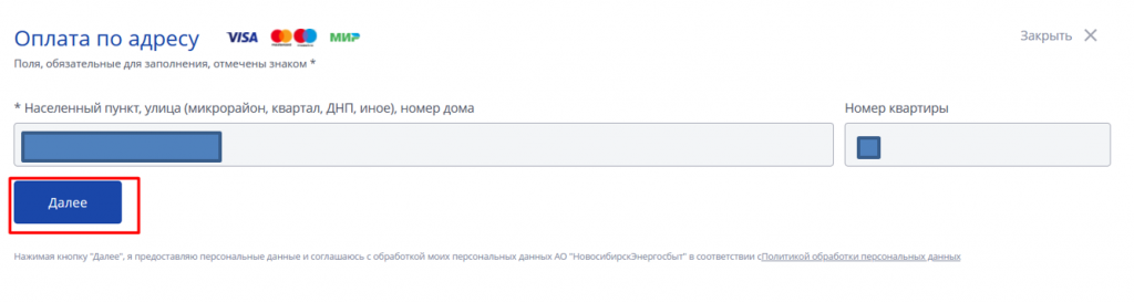 2. Если Вы выбрали "Оплата по адресу": Заполняете адрес, нажимаете "Далее"