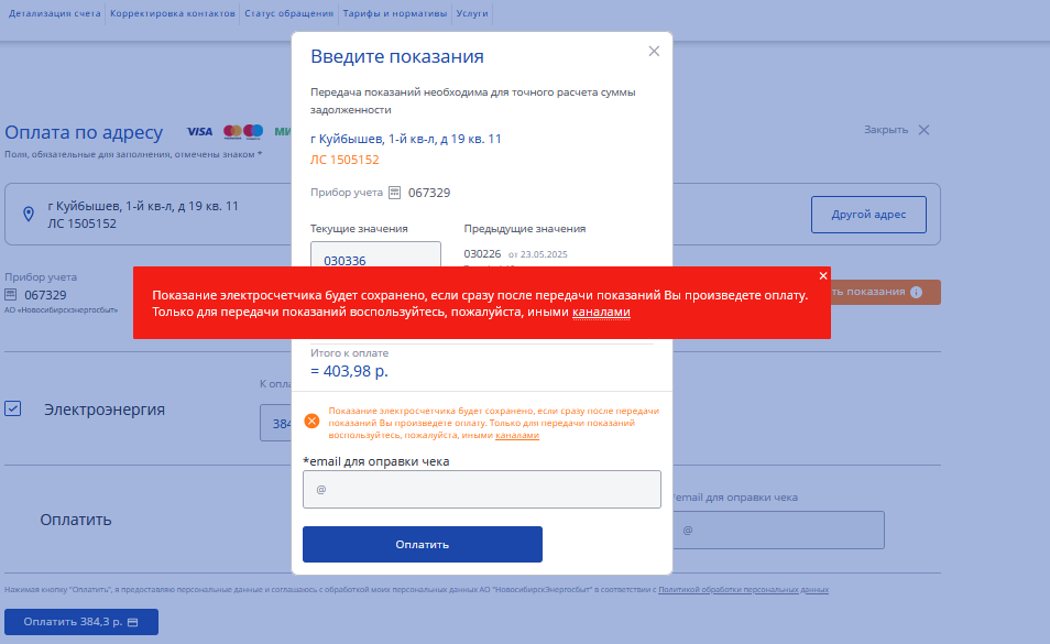 Рекомендуем вносить показания по электроэнергии в день оплаты.