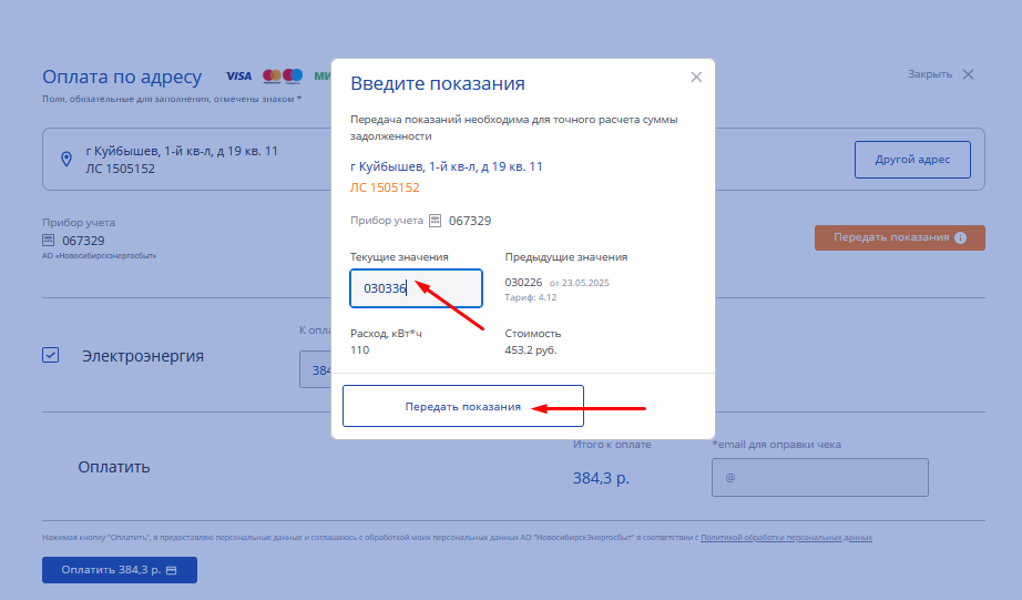 4. Введите текущее показание в открывшемся окне, затем нажмите "Передать показания".