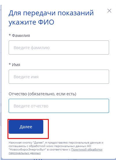 5. В открывшемся окне заполняете Ф.И.О. Обращаем внимание, что Ф.И.О. должно совпадать с данными лицевого счета, на имя которого он оформлен. Нажимаете "Далее".