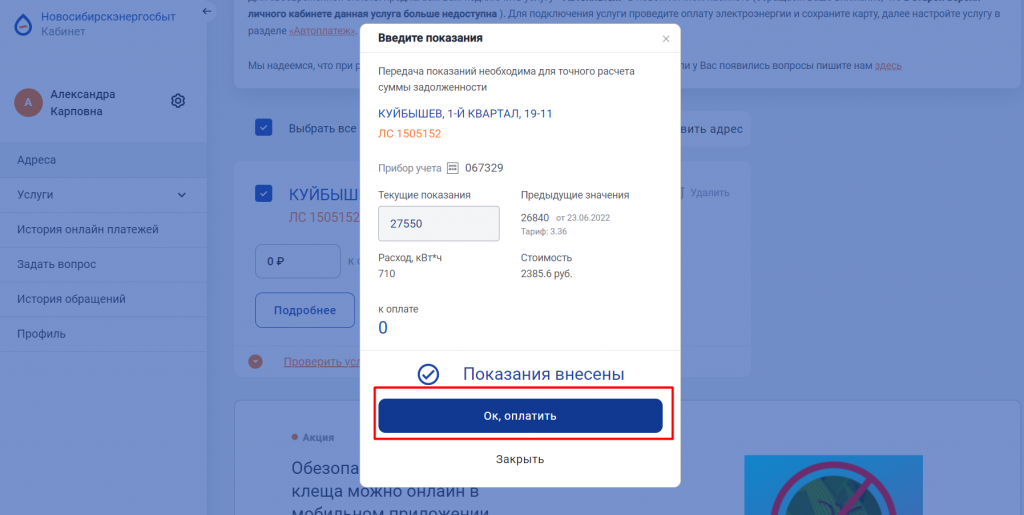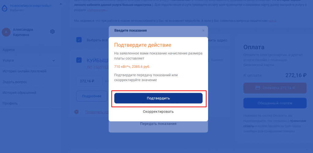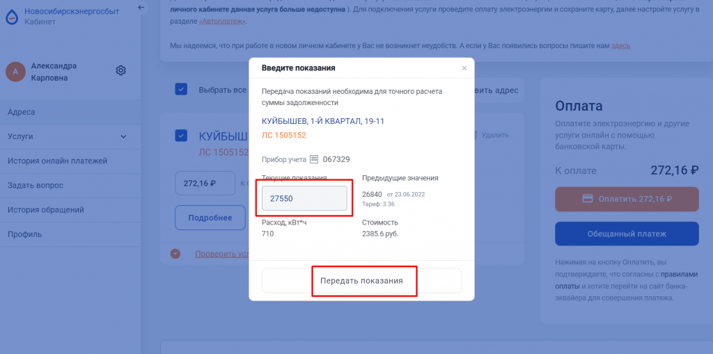 3. В открывшемся окне введите текущее показание счетчика и нажмите "Передать показания: